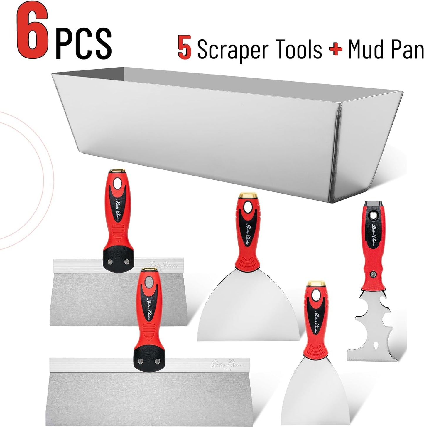 The set includes an ergonomically designed mud pan, which is essential for mixing and holding joint compound, as well as for cleaning the blades efficiently between applications.