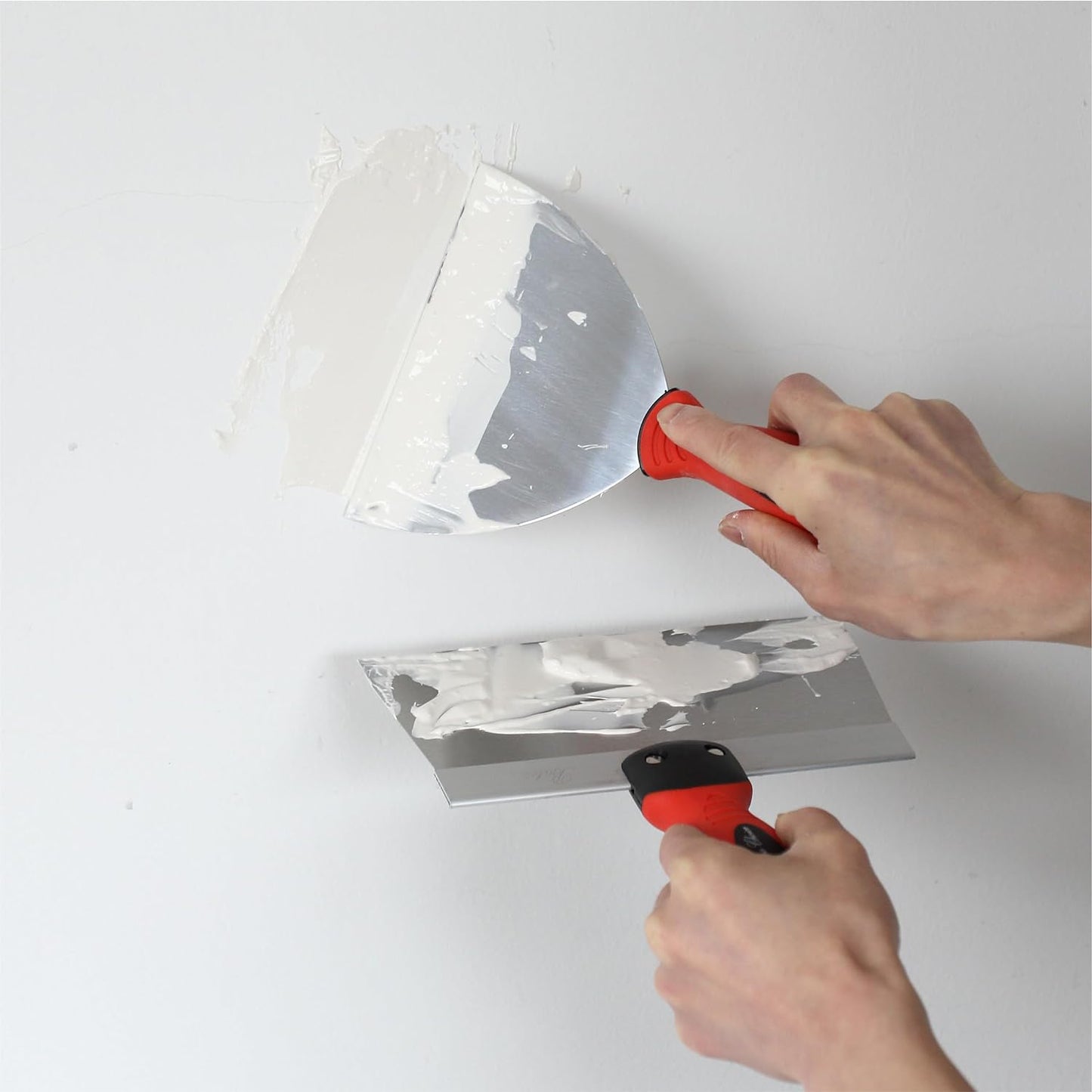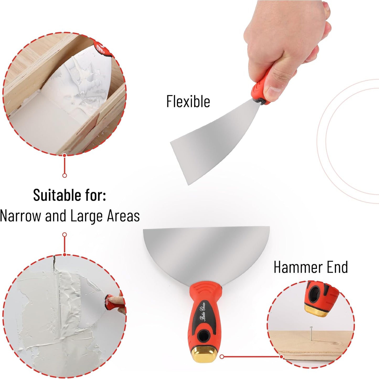 The handles of the taping knives are designed with comfort in mind, featuring an ergonomic, non-slip rubber grip that reduces hand fatigue during prolonged use.
